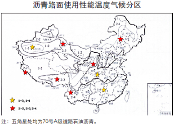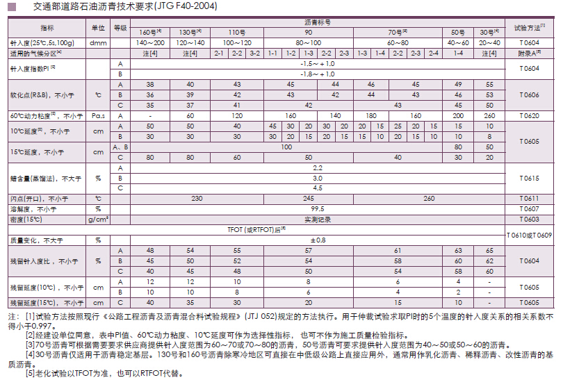 目前我国道路沥青根据不同标准分为:①重交通道路沥青AH-50、AH-70、AH-90、AH-110等(国标GB/T15180-2000);②普通道路沥青60号、100号、140号、180号等(石化行业标准SH0522-2000)。目前最广泛使用的是交通部《公路沥青路面施工技术规范》(JTGF40—2004),这个标准将重交通道路沥青和普通道路沥青合并为一个标准,引入道路沥青气候分区,并根据性能划分为A、B、C三个质量等级,其中应用最为广泛的是70号A级沥青。