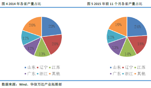 东北、辽宁、江苏、广州和浙江是我国主要的沥青产地,我国近八成的沥青都由这五个省的炼厂生产出来。2015年前11个月这五个省的产量分别达到704万吨、536万吨、418万吨、395万吨和345万吨。回顾2014年,这五个省全年产量分别为629万吨、542万吨、365万吨、324万吨和339万吨。在市场份额方面,山东、江苏和广东三个省份市场份额有小幅度的增加而辽宁市场份额有所减少,浙江市场份额和上年基本持平。除了这五个省之外,新疆、河北、上海、福建、内蒙古、四川、陕西、广西、降息、河南、湖北、黑龙江和安徽等地也都有沥青生产厂家。在厂家方面,三桶油旗下炼厂是沥青生产的主力军,其他炼厂市场份额占比较小。