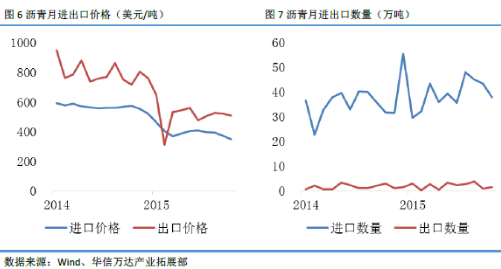 2014年我国沥青进出口价格分别为567美元/吨和797美元/吨。2015年前10个月,我国沥青进口平均价格396美元/吨,出口平均价格515美元/吨,比上年同期分别低44.70%和55.15%。预计今年平均进出口价格分别为314美元/吨左右和357美元/吨左右。