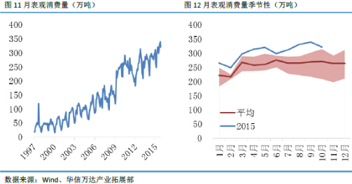 前10个月累计进出口量分别为392万吨和22万吨,去年同期进出口量分别为351万吨和18万吨。今年前10个月比去年同期累计净进口量多了11%,2014年全年累计进口量为439万吨,累计出口量为21万吨,净进口量为418万吨。按照11%增长率计算,2015年净进口量估计为464万吨左右。