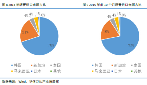 2015年我国沥青进口来源未发生明显变化。韩国是我国沥青进口主要来源国,2014年我国从韩国进口沥青287万吨,占我国沥青进口量的70%。2015年前10个月我国从韩国进口沥青279万吨,占我国沥青进口量的72%。新加坡是我国第二大沥青进口来源国,2014年从新加坡进口沥青87万吨,占总进口量19%。2015年前10个月我国从新加坡进口沥青74万吨,占总进口量的19%。泰国和马来西亚分别是我国第三和第四大沥青进口来源国,2014年我国从泰国和马来西亚进口沥青量分别为16万吨和15万吨,2015年前10个月我国从这两个国家进口沥青量分别为16万吨和14万吨。另外,我国约有1%的沥青来自日本,还有及少量的沥青来自伊朗、阿联酋和巴林。