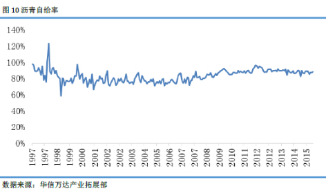1997年至今,我国沥青主要都是自给为主,1997年自给率为89.27%,2014年自给率为87.60%,2015年前10个月,自给率为87.88%。在过去的二十年时间里,我国沥青自给率基本稳定,平均自给率达到85.29%。也就是说,我国沥青净进口量只占表观消费量的14.71%。