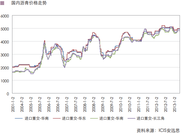 2008年原油价格暴涨暴跌,石油沥青价格波动也十分剧烈。尤其在下半年金融危机爆发后,华东国产重交石油沥青价格从最高位4450元/吨迅速下滑至年底的2600元/吨,跌幅达42%之多。2009年在国家大力兴建基础设施建设影响下,价格呈稳步上升趋势。自2010年以来,国内石油沥青价格均在第二季度出现上涨,2011年华东国产重交沥青波动幅度为12%,从年初均价4095元/吨上涨至5月份4896元/吨高点,后回落至年末的均价4621元/吨。2012年,华东国产重交石油沥青波动幅度为11%左右,从年初均价4625元/吨涨至10月份5150元/吨的高点,年末又回落至4725元/吨。