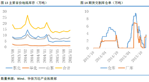 2014年底东北、华北和山东沥青地炼库存分别为10.61万吨、1.30万吨和8.83万吨,合计20.73万吨。今年11月底,三个地方地炼库存分别为4.85万吨、1.10万吨和8.16万吨,合计14.10万吨。根据以往经验,冬季春节前后往往是沥青地炼库存较多的时间,2014年3月合计库存达到26.74万吨,2014年12月库存达到20.73万吨。今年11月库存比上月略有增加,但是考虑到沥青较高的仓储成本和持续下行的价格,预计地炼企业主动囤货的意愿不足,2016年春节前后库存峰值或很难打破前几年记录。沥青期货注册仓单在很多程度上反应了实体企业和贸易商参加期货交易的意愿,交割库注册仓单与期货交易量和持仓量有明显的正相关关系。2014年前三季度沥青交割库注册仓单较多,但是国庆节前后沥青期货交割库注册仓单基本归零。今年沥青期货注册仓单在夏季开始逐步增加国庆节前后大幅减少,但是和去年不同的是今年冬季沥青期货交易活跃,冬季又有了部分注册仓单生成。