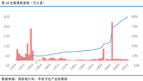 我国道路里程在1949年建国以后基本保持增长势头,在1989年首次突破100万公里,2005年首次突破300万公里,2014年道路里程达到446.39万公里,比2013年多2.47%,也就是10.77万公里。除去2005年道路里程暴增78.82%,2006年至2014年稳步增长,年均增长率为3.26%,如果继续保持这个增长率,2015年道路里程或将达到460.93万公里,2016年或将达到475.95万公里。