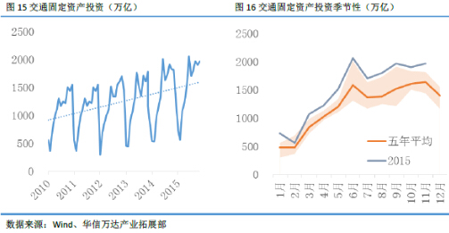 2014年我国交通固定资产投资16784亿元,今年前11个月我国交通固定资产投资16548亿元,比上年同期多6.73%。如果今年12月仍保持这个增长率的话,今年我国交通固定资产投资有望达到15655亿元。交通固定资产投资在过去的几年也稳中有升的同时也体现出一个明显的季节性规律。根据2010年到2014年数据分析发现,每年1月到5月我国交通固定资产投资小于全年平均水平,其余月份投资额大于全年平均水平。1月和2月最为明显,仅为平均水平的40.10%和39.89%,而3月为全年平均水平的69.54%。6月、10月和11月交通固定资产投资相对较多,为全年平均水平的130.65%、132.94和135.15%。2015年前11个月,我国交通固定资产投资额均大于过去5年平均水平,除2月外的其他10个月均大于过去五年个月的最大值。