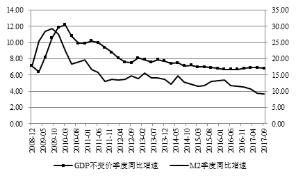 图1 GDP增速与M2增速变化趋势(2008/12-2017/09)