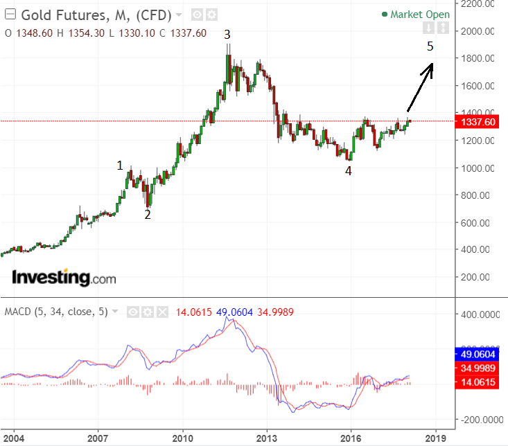 技术面看,金价也处于牛市当中,可能将呈现5浪升势。且浪5可能会触及浪3高位1911美元/盎司,出现这种走势的概率很高。