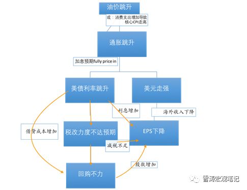 即使油价跳升对能源板块形成支撑,油价引起的通胀将会沿另一条逻辑线令美股盈利走弱,股价崩溃。