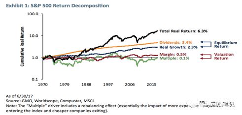 而1970年至今美股6.3%的年化回报率中仅有0.6%是由估值因素贡献的,股息分红贡献了3.4%,实际经济增长贡献了2.3%(和美国长期GDP增速接近)。