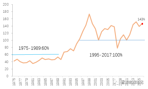 “巴菲特指标”(美股总市值在GDP中的占比)目前位于143%的历史高位,而1970年至1995年的历史中值为60%左右,1995年至2017年的历史中值为100%左右。