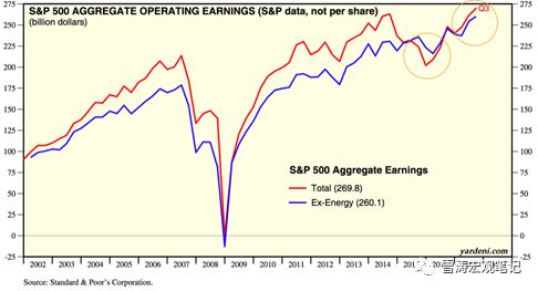 从美国内部因素看,三季度美股资本开支从二季度的-0.4%大幅提升至三季度的8.8%,引发市场看好情绪。这其中能源板块自2014年底油价大跌以来首次出现资本开支同比正增长(-5%到31%)。下图可见能源板块对S&P的营收和盈利影响非常大。
