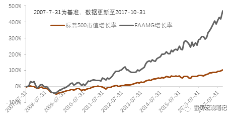 而这次不一样,互联网技术企业的市值增长完全与其利润贡献匹配。2017年,标普科技股指数和盈利几乎同步增长,股价上升反映的是基本面。