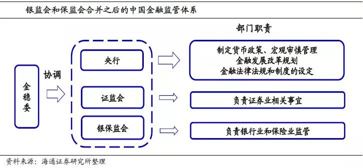 因此,治标之后还得治本,而治本的关键就在于金融监管体系的改进。从17年全国金融工作会议决定设立国务院金融稳定发展委员会(以下简称“金稳委”),到两会机构改革方案中提到合并银监会和保监会,实际上都是对我国金融监管体系的调整。