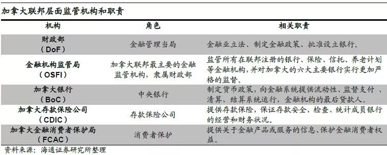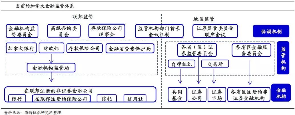加拿大实行联邦和地方的两级平行监管。加拿大金融机构的注册归属分为联邦(包括所有银行、在联邦注册的保险公司、信托公司、信用社等)和地方省区(包括证券公司、地方注册的非证券金融公司),联邦和地方分别负责监管其下注册的金融机构,两级监管部门并无隶属或重叠的关系,尽量避免监管的空白和冲突。