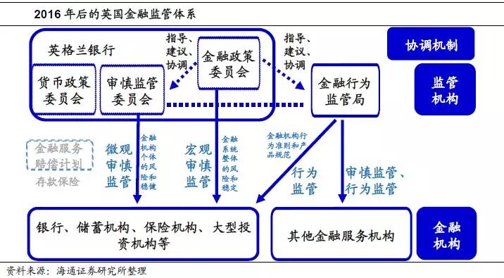16年英国再度加强了央行的审慎监管职责。英国将审慎监管局并入英格兰银行内部,并设审慎监管委员会(PRC)履行其职能。金融政策委员会是这一框架中最重要的角色,对审慎监管局和金融行为监管局均有指导、建议的权力,同时三个监管机构通过建立协调机制,加强沟通合作。而作为存款保险的金融服务赔偿计划(FSCS)则是独立于监管机构之外。