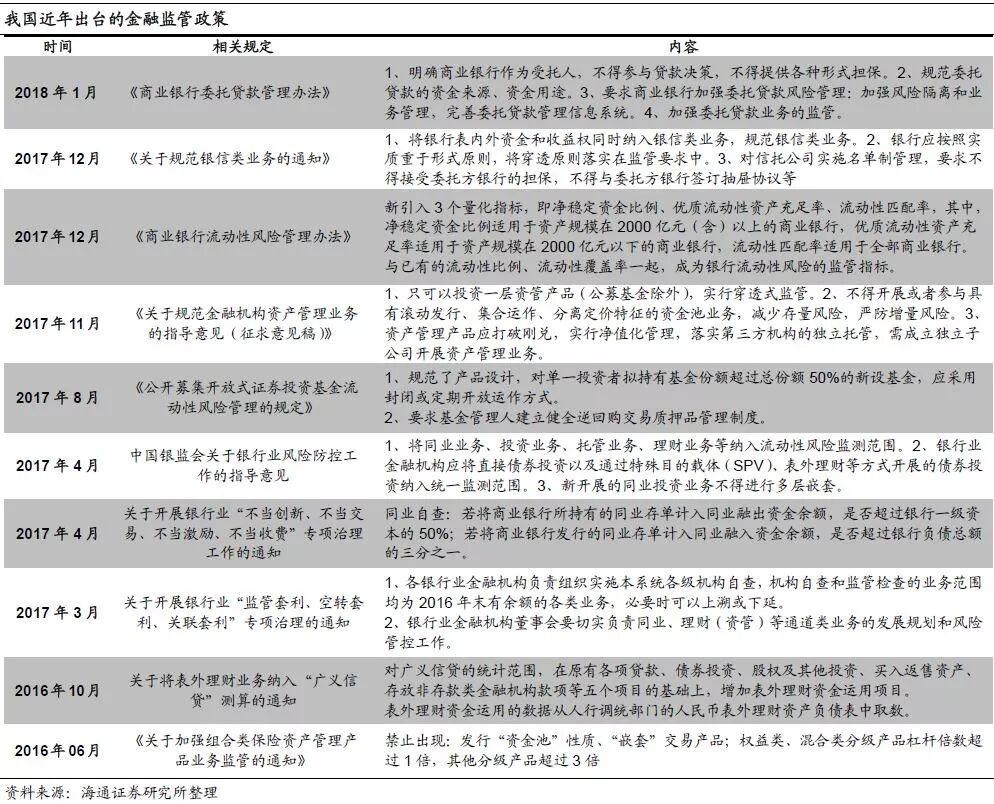 我国金融业的风险与监管。在金融自由化的背景下,我国金融行业快速扩张,出现了综合经营的趋势,但原有的分业监管难以跟上金融创新的脚步,导致监管套利日趋频繁,给金融体系埋下风险隐患。16年以来针对金融机构行为的监管政策频出,包括将表外理财业务纳入“广义信贷”、修改商业银行流动性风险管理指标、打破银行理财产品刚兑、禁止资管产品多层嵌套、加强银行业同业交易监管等等,都是对金融行业无序扩张后出现问题的修补。