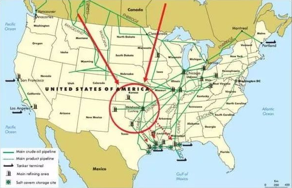 因为原油期货最终还是大宗商品,必须要进行实物交割,既然有实物交割的需求,那么对于储存设备以及交通设施就会有严苛的要求。以WTI原油期货为例,交割地位于美国的俄克拉荷马库欣,虽然这个小镇名不见经传,但却是北美能源的中心地。