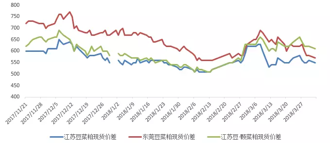 3 月23日起中美贸易战30亿美元;4 月4日,500 亿美元;4 月 6 日,潜在的1000亿美元,半个月内贸易战以一个令人猝不及防的速度打响,清明假期,国内豆粕现货价涨180-230元/吨,菜粕现货价涨160-230元/吨,随着豆粕价格大幅上涨,豆菜粕价差逐渐拉开。