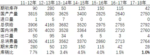 花生粕:本年度花生粕产量较去年基本持平,维持379-380万吨的水准,进口量维持40万吨,总供给量较去年略增加6万吨至390万吨,消费上较去年增加8万吨至386.1万吨,导致花生粕结转库存为3.9万吨,低于去年的6万吨,库存消费比下滑至1.01%,是2014-15年度以来的低位。