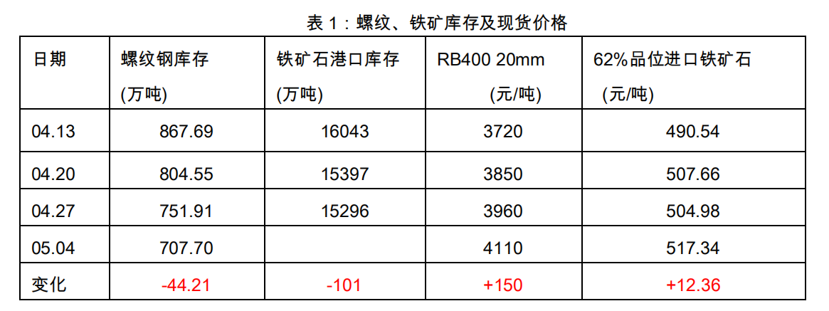 螺纹钢社会库存自 3 月 16 日当周开始结束 11 连增,截至 5 月 4 日当周报于 707.70 万吨,较上周减少 44.21 万吨,已经连续八周环比小幅下降,螺纹钢企业库存截至 4 月 27 日当周报于 225.12 万吨,较上一周期回落 36.41 万吨,连续五周环比回落,社会库存与企业库存的双双回落,显示出近期螺纹钢出库情况较好,下游需求正在回暖。全国高炉开工率报于68.92%,较上周的 67.68%提升 1.24 个百分点,钢材供给端也在缓慢增加。