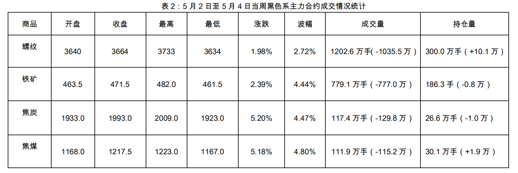 螺纹主力 1810 合约 5 月 2 日-5 月 4 日当周三个交易日,小幅收涨 1.98%,波动幅度 2.72%,交投重心较上周进一步上移。期价开盘于 3640 元/吨,最高上探 3733 元/吨,最低触及 3634 元/吨,收盘于 3664 元/吨。由于五一小长假因素,成交量低迷,本周成交量较上周大减 1035.5 万手至 1202.6 万手;持仓热情快速回升,截至周五持仓量报于 300.0 万手,较上周增加 10.1 万手。其他黑色系商品中,铁矿小幅跟涨,双焦均大涨超 5%。