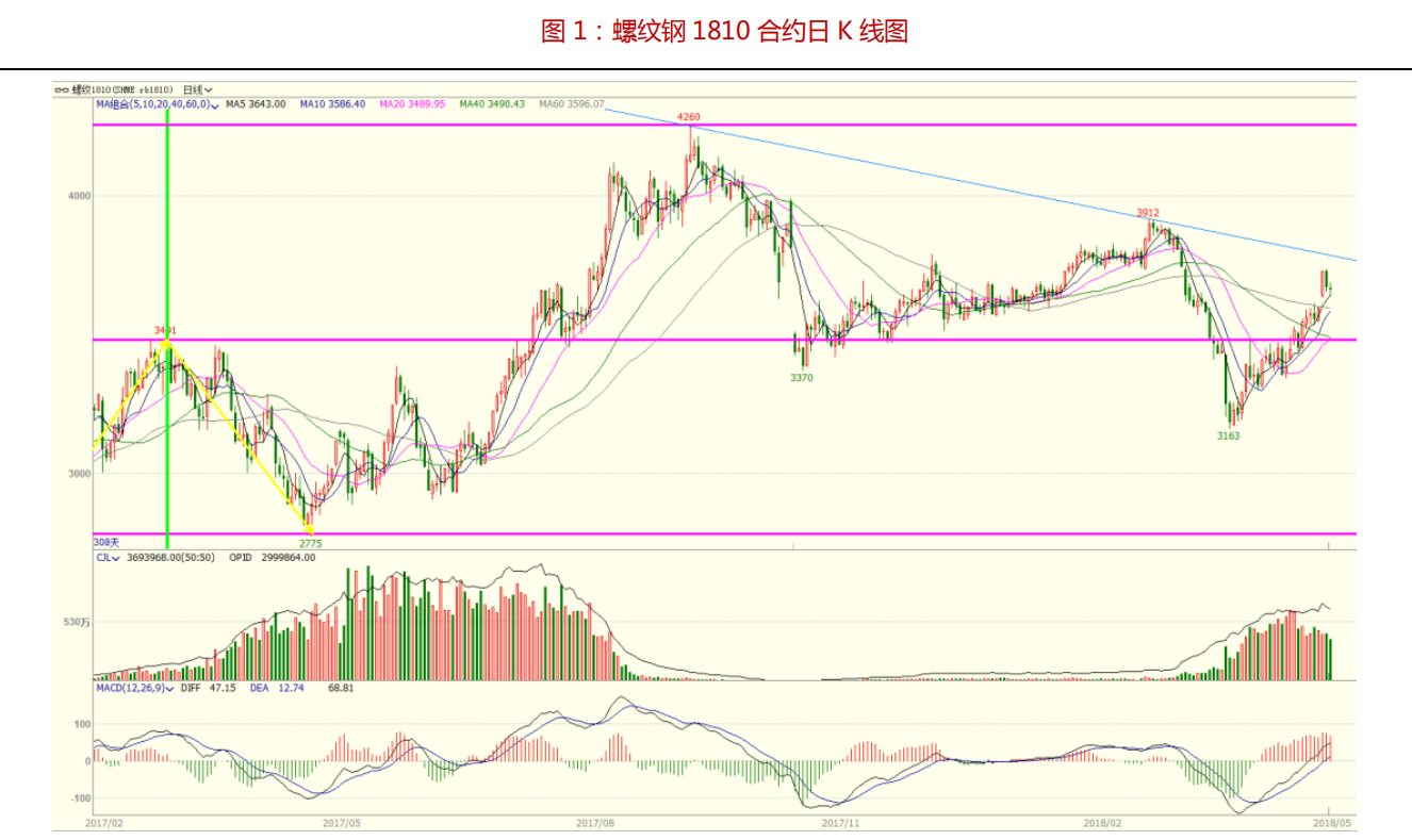 螺纹 1810 合约本周仅三个交易日报收一阳两阴格局,周三在五一小长假期间现货飙涨 150 元/吨的提振下,跳空高开高走,有效突破 60 日线并且站上 3700 点大关,随后两个交易日维持高位震荡,上行稍显承压,交投重心较节前有显著抬升,维持三月低以来的反弹走势,短期均线拐头向上突破长期均线,日均成交稍显低迷,但持仓量较上周有所增加,技术指标 MACD 形成金叉并且红柱不断放大,依托 60 日线偏多运行,关注上方 3800 点一线的压力位能否顺利突破。