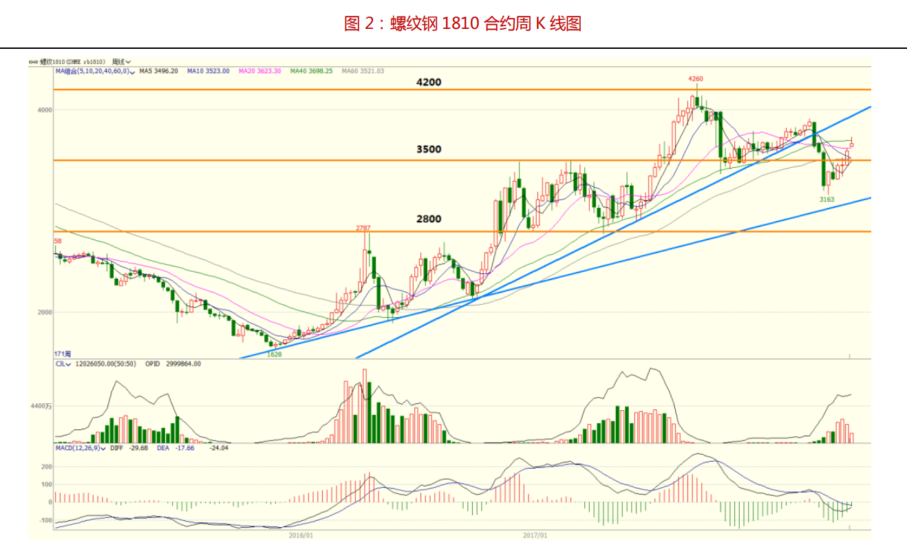 螺纹 1805 合约周线周期报收小阳线,自 3163 元/吨的阶段低点震荡回升,逐渐收复长期至短期均线,本周触及 40 周均线。从中长期看,近两年期价运行于良好的上行通道中(斜率较低的蓝色直线),本轮调整也在逼近上升趋势线后止跌反弹,在突破 3500点一线后,5 周、10 周和 60 周均线粘合,对期价形成有效支撑,上行可以尝试继续看高一线。