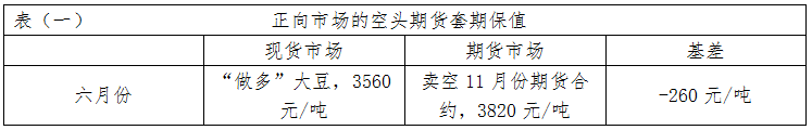 假设某农场在10月份要收获一批大豆。在第二季度国内大豆价格一直在上涨。农场担心价格不会无限制持续上涨,未来价格可能会出现下跌。农场希望能维持现有价格水平下可能产生的部分利润,即将价格锁定在当前的价格水平上,因此决定利用大连商品交易所11月份大豆期货合约对其10月份收获的大豆进行套期保值。6月份时,市场上的大豆现货价格为3560元/吨。11月份大豆期货合约价格为3820元/吨,因此大豆市场处于正向市场中。当前基差为-260元吨(3560-3820)。农场按每吨3820元的价格在大连商品交易所卖出了11月份的大豆期货合约,则农场现在已经套期保值的头寸如表表(一)所示: