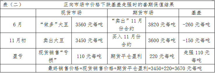 假设到11月初时,农场的大豆已经全部收获完毕。届时11月大豆期货的价格已经下跌至3600元/吨,而现货价格下跌至3450元/吨。需要注意的是,此时的基差为-150元/吨,即基差已经走强了。在这种情况下,农场可以在现货市场中以每吨3450元的价格销售其大豆,同时按照每吨3600元的价格买进11月份期货合约平仓期货头寸。则套期保值的结果如表(二)所示。