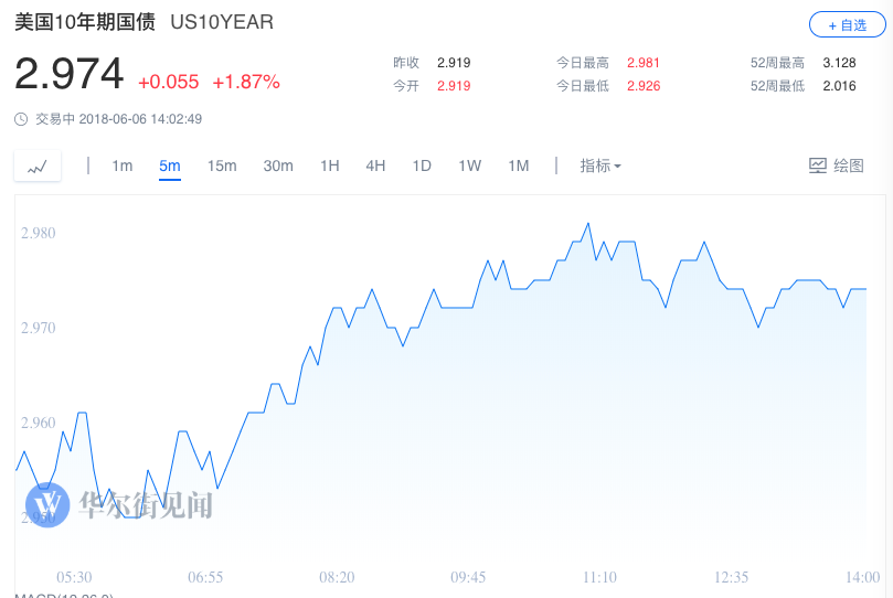 周三(6月6日)纽约尾盘,美国10年期基准国债收益率上涨4.40个基点,报2.9177%,5月18日曾涨至3.1261%,逼近2011年7月8日盘中高位3.1805%。 两年期美债收益率涨2.44个基点,报2.5161%,5月17日曾涨至2.5957%,逼近2008年8月6日盘中高位2.6276%和当年7月24日高位2.8309%点。