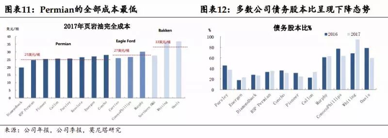 运营层面:2017年全部成本为28美元/桶(图表11),同比下降31%,主要原因是来自单井产量的提升。按产区来分,主营业务在Permian的公司的全部成本水平相较于Eagle Ford和Bakken来说最低,平均为25美元/桶,侧面解释了钻机数增幅大多来自Permian的原因。