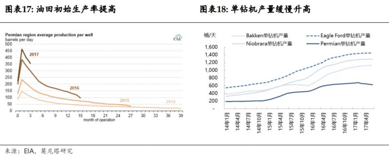 初始生产率可以用来测量油井生产效率——给定时间内,单口井的采油量。以Permian为例,2013年初始采油速率少于100桶/天,2017年初始采油速率已经高于450桶/天(图表17)。