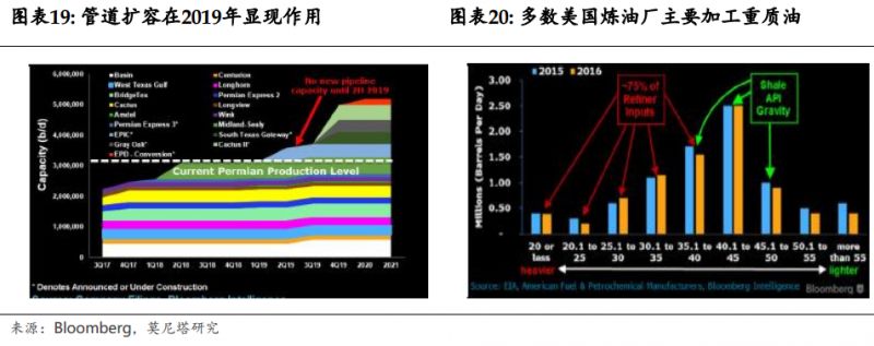 本轮Brent-WTI价差的持续扩大主要源自于,1)国际原油市场因OPEC高减产执行率、委内瑞拉产量持续下滑、美国退出伊核协议而出现潜在的供给缺口;2)美国原油市场则因Permian地区原油产量的快速增长、Permian地区管道运输瓶颈(图表19)、及当地炼油厂加工轻质油品能力有限(图表20)而出现供应偏多的局面。相较于管道运输,Permian-House运油方式还包括火车和卡车。根据Bloomberg的统计,火车运费为6-8美元/桶,卡车运费则为12-16美元/桶,均高于管道运输。未来某个时刻,Brent-WTI价差或许会因为Midland-Sealy管道扩容(运输能力由原先的45万桶/日提升至57.5万桶/日)略有收窄。然而,在美国原油产量继续不断上涨的前提下,我们认为有效的价差缩小应至少会在2019年下半年EPIC(59万桶/日)、Cactus二号线(58万桶/日)和Gray Oak(38万桶/日)等管道的投入使用时出现。