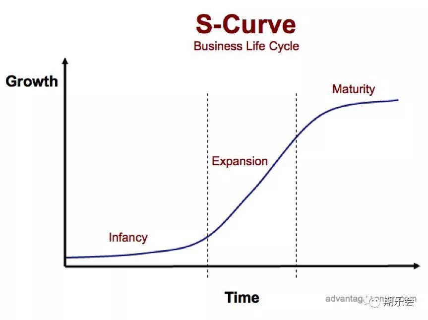 你可以忽略其中所有的数学细节,记住这个形状就可以。很多学者把这个形状称为“S曲线”。一般公司业务的增长,常常就是S曲线——