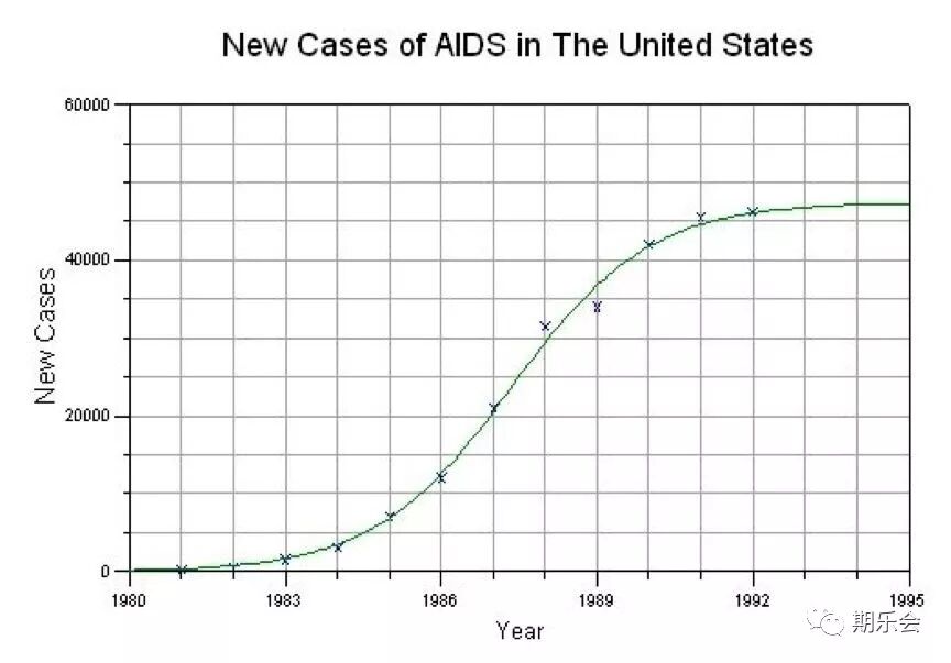 这种增长现象在自然界也存在,比如美国每年新感染艾滋病毒的人数,也符合S曲线——