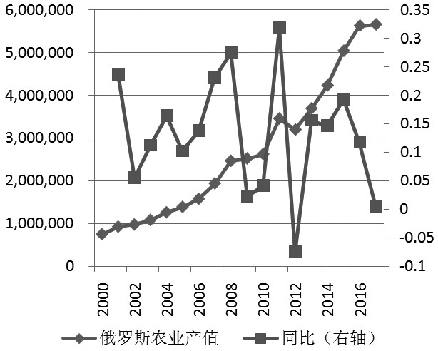 2008年之后,随着美国金融危机影响范围的扩大,全球经济陷入低迷状态,俄罗斯经济也受到一定程度的影响。2009年,俄罗斯农业产值增长率比2008年下降25.2%, 2012年出现负增长,到了2015年和2016年俄罗斯农业总产值分别上涨19.21%和11.69%。俄罗斯农业发展出现波动的主要原因包括两个方面:一是俄罗斯农业基础相对薄弱,易受到国际市场波动的影响;二是俄罗斯的自然气候变化造成了其农业产值的大幅度变化, 如2010年旱灾造成农作物大规模减产。