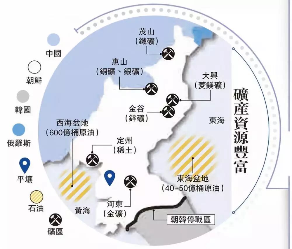 朝鲜拥有丰富的矿产资源,包括铁矿、铜矿、银矿、锰、锌、稀土、金矿,另外东海盆地和西海盆地都蕴藏着丰富的石油。其中,朝鲜所蕴藏的稀土更是备受关注,稀土是电动汽车电机和众多高科技电子装置的重要原料,传闻朝鲜有高达两亿多吨稀土。