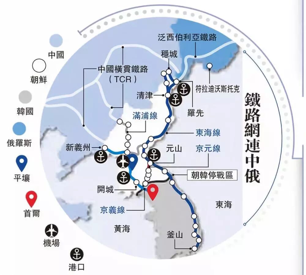 东海线则是连接韩国釜山和朝鲜安边的路线,但其中一段铁路中断。铁路网一旦完成翻新工程,可望加速连接西伯利亚铁路,将平壤的货物输出欧洲。