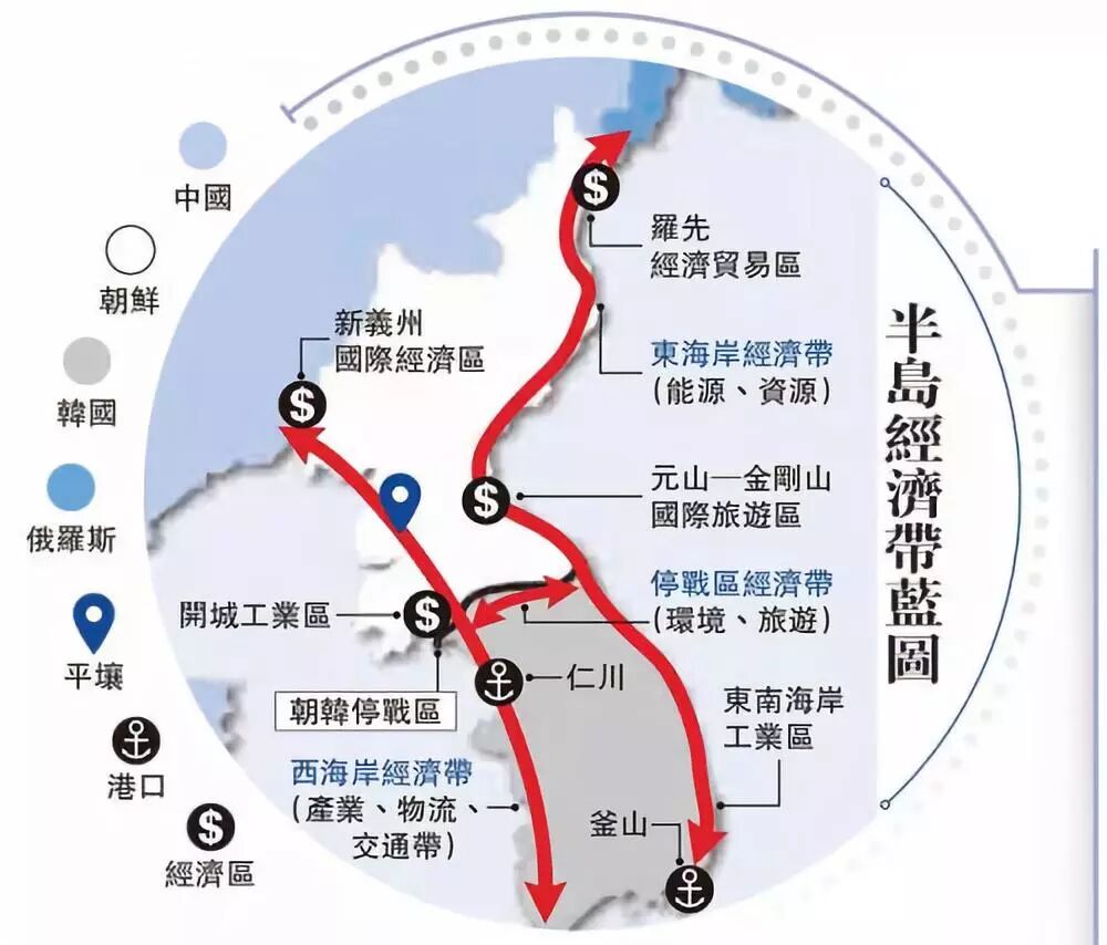 韩国总统文在寅已经在去年透过“朝鲜半岛新经济地图”构想,展示了朝韩共同开发的战略,其核心是朝鲜半岛上建立三个经济带:西海岸经济带将半岛西部与中国连接,将让这个区域成为物流中心;另一是朝鲜半岛与俄罗斯的连接,旨在强化与俄在能源方面的合作;最后则是在朝韩边界发展旅游业。