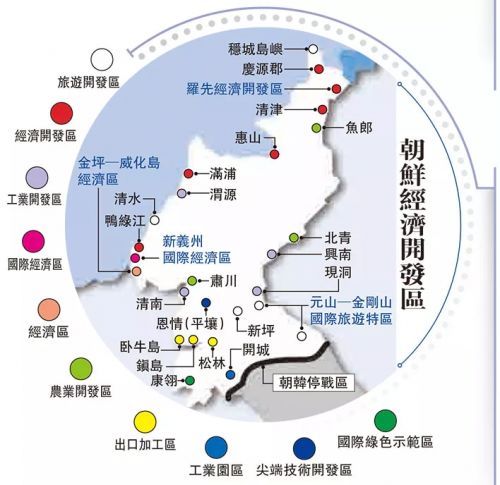 朝鲜目前一直在推动对罗先经济贸易区、开城工业园区、金刚山旅游特区、新义州国际经济区、金坪与威化岛经济贸易区等五大中央级大规模经济特区,同时还有20多个中小规模的经济特区的招商引资活动。