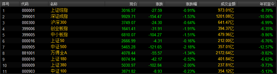 截至早盘收盘,沪指收报3016.57点,跌0.91%,成交973亿。深成指收报9929.71点,跌1.53%,成交额1201亿。创业板收报1641.41点,跌1.91%,成交额394亿。
