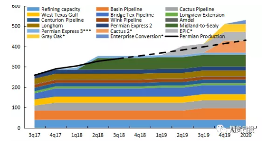 从历史的数据上来看,18年1季度,该地的管道运力出现瓶颈,导致湾区库存明显累积近3400万桶,同时也使得Permian地区的季度产量增速由11%下降至5%。保守估计Permian地区后续的季度产量增速为4%,对比当地大管道运输能力如图5所示。