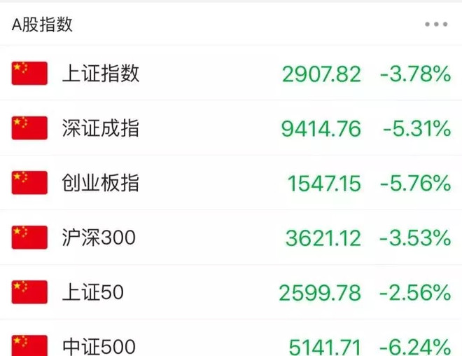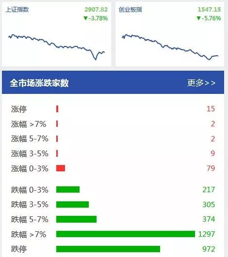 A股市场重现近千股跌停,上证综指盘中一度失守2900点整数关口,创两年来新低。截至收盘,上证综指下跌3.78%,报2907.82点,创23个月来新低;深成指跌5.31%报9414.76点,创业板指跌5.76%报1547.15点。