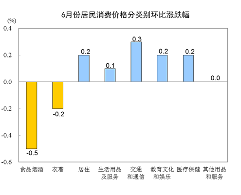 其他七大类价格环比五涨一降一平。其中,交通和通信、生活用品及服务价格分别上涨0.3%和0.1%,居住、教育文化和娱乐、医疗保健价格均上涨0.2%,衣着价格下降0.2%,其他用品和服务价格持平。