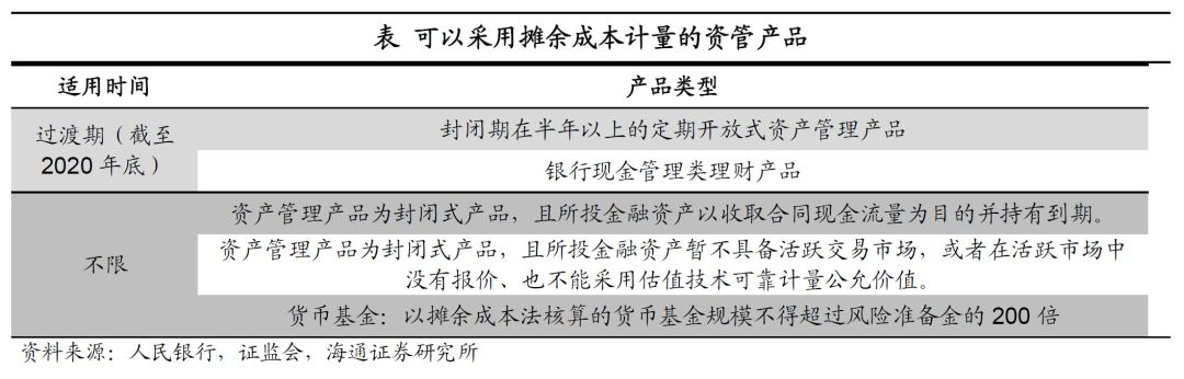 《央行通知》明确过渡期内允许封闭期半年以上的定开产品、银行现金管理类理财产品采用摊余成本法计量。这意味着“类货基”理财等产品可暂参照货币市场基金“摊余成本法估值+影子价格法监控”的估值方法,根据资管新规偏离度设置为5%。但过渡期结束后是否继续沿用这一规定仍有不确定性,对上述产品的规模形成制约。