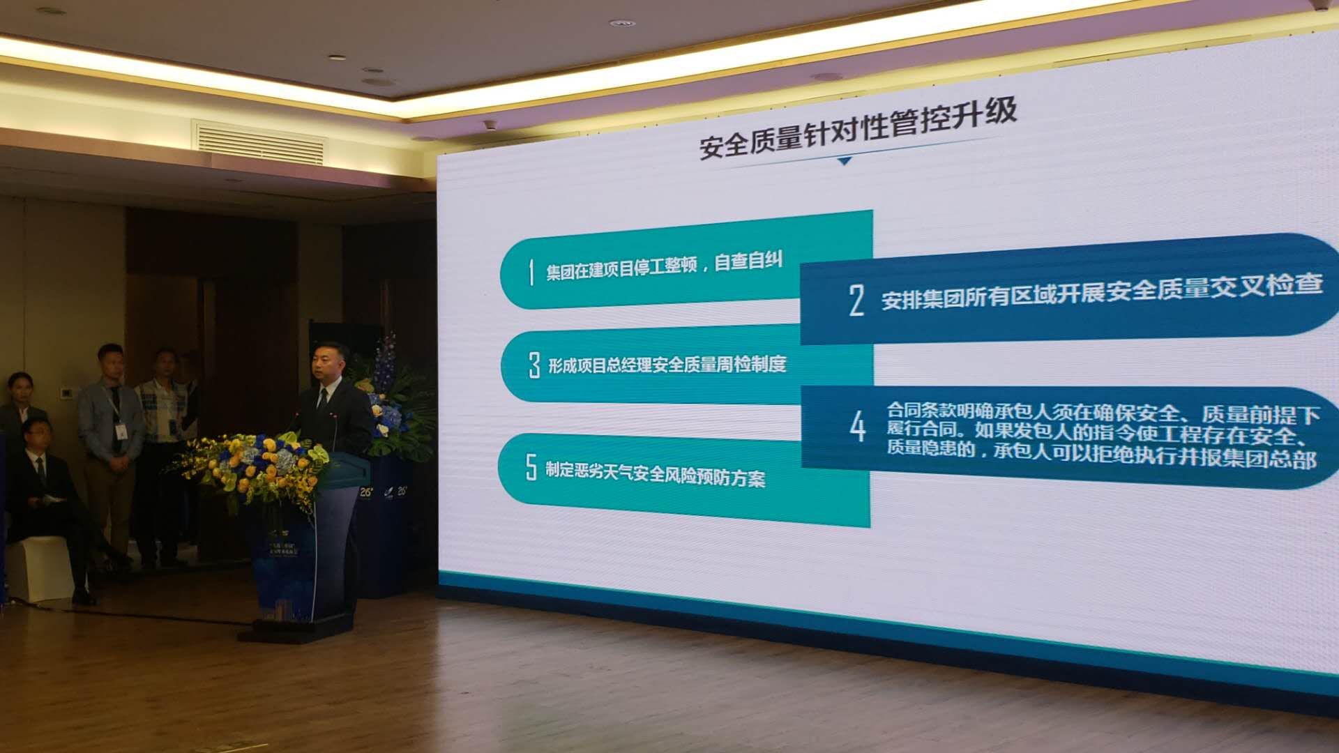 他还介绍了五大举措:楼盘平均交付工期17-21个月,集团在建项目停工整顿,自查自纠;安排集团所有区域开展安全质量交叉检查,为期15天;形成项目总经理安全质量周检制度;存在安全问题承包方可以拒绝施工;制定恶劣天气安全风险预防方案。