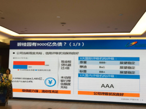 碧桂园首席财务官兼副总裁伍碧君介绍公司财务情况时称,公司现金充裕,信用评级良好。