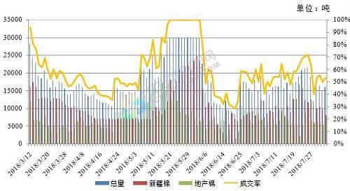 上周(2018年7月30-8月3日)是2017/2018年度储备棉轮出第二十一周,中国储备棉管理有限公司上市交易储备棉15万吨,其中新疆棉4.6万吨,地产棉10.4万吨;实际成交7.6万吨,成交率50.67%,新疆棉成交4.5万吨,成交率97.8%,地产棉成交3.1万吨,成交率29.8%。