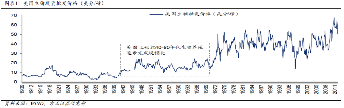 分析首先指出规模化不仅不会平滑猪价,反而会加大猪价的振动幅度。对比美国的猪周期,规模化程度越强,行业淘汰越惨烈,也就是说亏的更多,价格更低才能把更多的人挤出去,越往后去,淘汰难度的边际效应越大。此轮猪周期是中国快速规模化的过程,规模化加速的主要原因是“政策的引导”和“非农收入占比迅速提升”的结果。